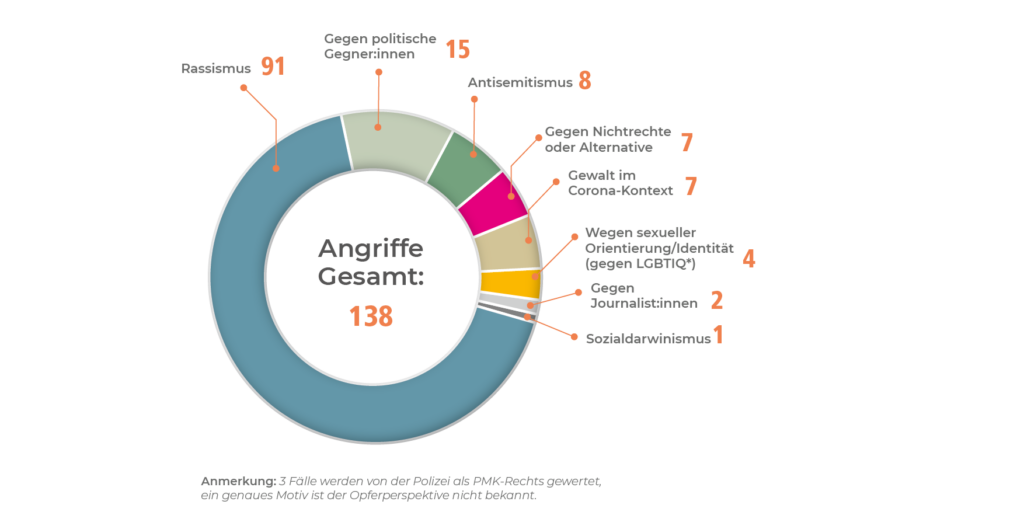 Hinter der Erfassung rechter Gewalttaten und der Veröffentlichung einer seriösen Jahresstatistik steckt eine umfangreiche Arbeitsleistung. Sie ist das Aggregat einer akribischen Auswertung von hunderten Vorfällen mit rechten Bezügen, Ausdruck eines Ringens um Deutungen mit staatlichen Behörden, Abbild von Zugängen der Beratungsstelle zu betroffenen Communities und Gruppen, und der vorhandenen Ressourcen der Berater:innen für die proaktive Recherche. Die Frage, was genau sich aus den Angriffszahlen der Jahresstatistik ablesen lässt, und wo die Grenzen ihrer Aussagekraft liegen, begleitet die Beratungsstelle bis heute.
