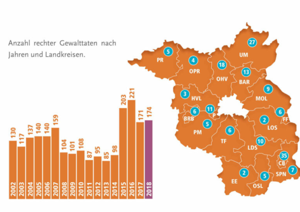 Unsere Jahresstatistik 2018 trägt angesichts der Anzahl als auch des Ausmaßes der Gewalt nicht zur Beruhigung bei: 174 rechte Gewalttaten zählten wir im vergangenen Jahr. Darunter Angriffe, wie in Eberswalde, bei denen die Täter offenbar den Tod der Betroffenen in Kauf nahmen. Als regionale Schwerpunkte kristallisierten sich erneut die Stadt Cottbus und der Landkreis Uckermark heraus. Über Cottbus hat nun unser Mitarbeiter ­Joschka Förschner zusammen mit dem Historiker Jakob Warnecke eine umfangreiche Broschüre geschrieben.