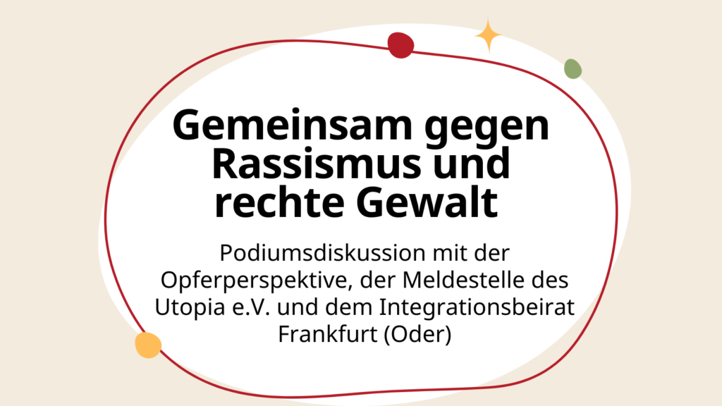 Zusammen mit der Meldestelle des Utopia e.V. und dem Integrationsbeirat Frankfurt (Oder) laden wir am kommenden Dienstag, 27. September herzlich zur Podiumsdiskussion „Gemeinsam gegen Rassismus und rechte Gewalt“ ein.