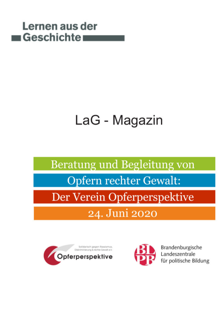 Die Juni Ausgabe des Magazins „Lernen aus der Geschichte“ wurde in Zusammenarbeit mit der Opferperspektive erstellt und gibt einen Einblick in unsere Arbeit. Wir bedanken uns bei dem LaG-Team für diese tolle Gelegenheit und die anregenden Gespräche.