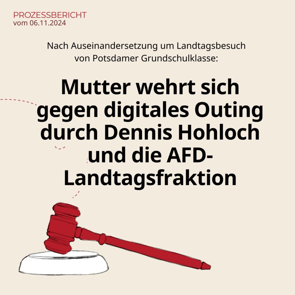 Die Mutter eines betroffenen Kindes hatte sich über den schulinternen Mailverteiler an die anderen Eltern gewandt, von der verstörenden Erzählung ihres Kindes zu der besagten Veranstaltung berichtet und vorgeschlagen, sich mit einem gemeinsamen Elternbrief an die Landtagspräsidentin zu wenden, um eine Aufarbeitung der Geschehnisse zu fordern. Die Elternmail gelangte in die Hände von Dennis Hohloch, der aus ihr in einer Pressekonferenz der AFD-Fraktion zitierte, den Inhalt verzerrte und die Mutter namentlich unter Rückgriff auf vormalige berufliche Tätigkeiten outete. Es folgten mehrere Social-Media-Beiträge von Hohloch und der AFD-Fraktion auf Tiktok, Instagram, X und Facebook, die hundertfach geteilt und in den Kommentarfunktionen zum Sammelbecken für digitalen Hass wurden. Gegen das Outing auf Social Media ging die Mutter mit den heute verhandelten Unterlassungsverfügungen vor.