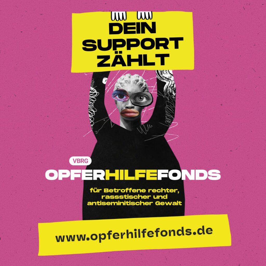 Unser Dachverband, der Verband der Beratungsstellen für Betroffene rechter, rassistischer und antisemitischer Gewalt VBRG, sowie Beratungsstellen bundesweit stehen konsequent an der Seite derjenigen, die unter solchen Übergriffen leiden. Mit dem Opferhilfefonds setzen wir uns dafür ein, Menschen dabei zu unterstützen, die schwerwiegenden Folgen eines rechten Angriffs zu bewältigen.
