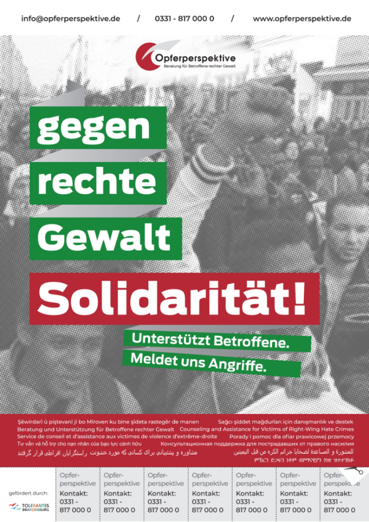 Seit 1998 ist die Opferperspektive im Land Brandenburg beratend an der Seite der Betroffenen rechter Gewalt und rassistischer Diskriminierung, derer Freund:innen, Angehörigen und Zeug:innen.