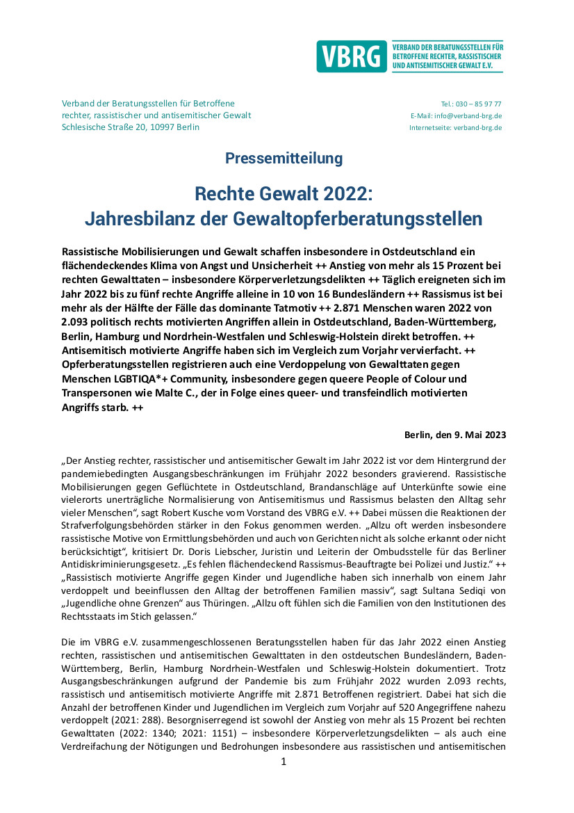 Berlin – „Der Anstieg rechter, rassistischer und antisemitischer Gewalt im Jahr 2022 ist vor dem Hintergrund der pandemiebedingten Ausgangsbeschränkungen im Frühjahr 2022 besonders gravierend. Rassistische Mobilisierungen gegen Geflüchtete in Ostdeutschland, Brandanschläge auf Unterkünfte sowie eine vielerorts unerträgliche Normalisierung von Antisemitismus und Rassismus belasten den Alltag sehr vieler Menschen“, sagt Robert Kusche vom Vorstand des VBRG e.V. ++ Dabei müssen die Reaktionen der Strafverfolgungsbehörden stärker in den Fokus genommen werden. „Allzu oft werden insbesondere rassistische Motive von Ermittlungsbehörden und auch von Gerichten nicht als solche erkannt oder nicht berücksichtigt“, kritisiert Dr. Doris Liebscher, Juristin und Leiterin der Ombudsstelle für das Berliner Antidiskriminierungsgesetz. „Es fehlen flächendeckend Rassismus-Beauftragte bei Polizei und Justiz.“ ++ „Rassistisch motivierte Angriffe gegen Kinder und Jugendliche haben sich innerhalb von einem Jahr verdoppelt und beeinflussen den Alltag der betroffenen Familien massiv“, sagt Sultana Sediqi von „Jugendliche ohne Grenzen“ aus Thüringen. „Allzu oft fühlen sich die Familien von den Institutionen des Rechtsstaats im Stich gelassen.“