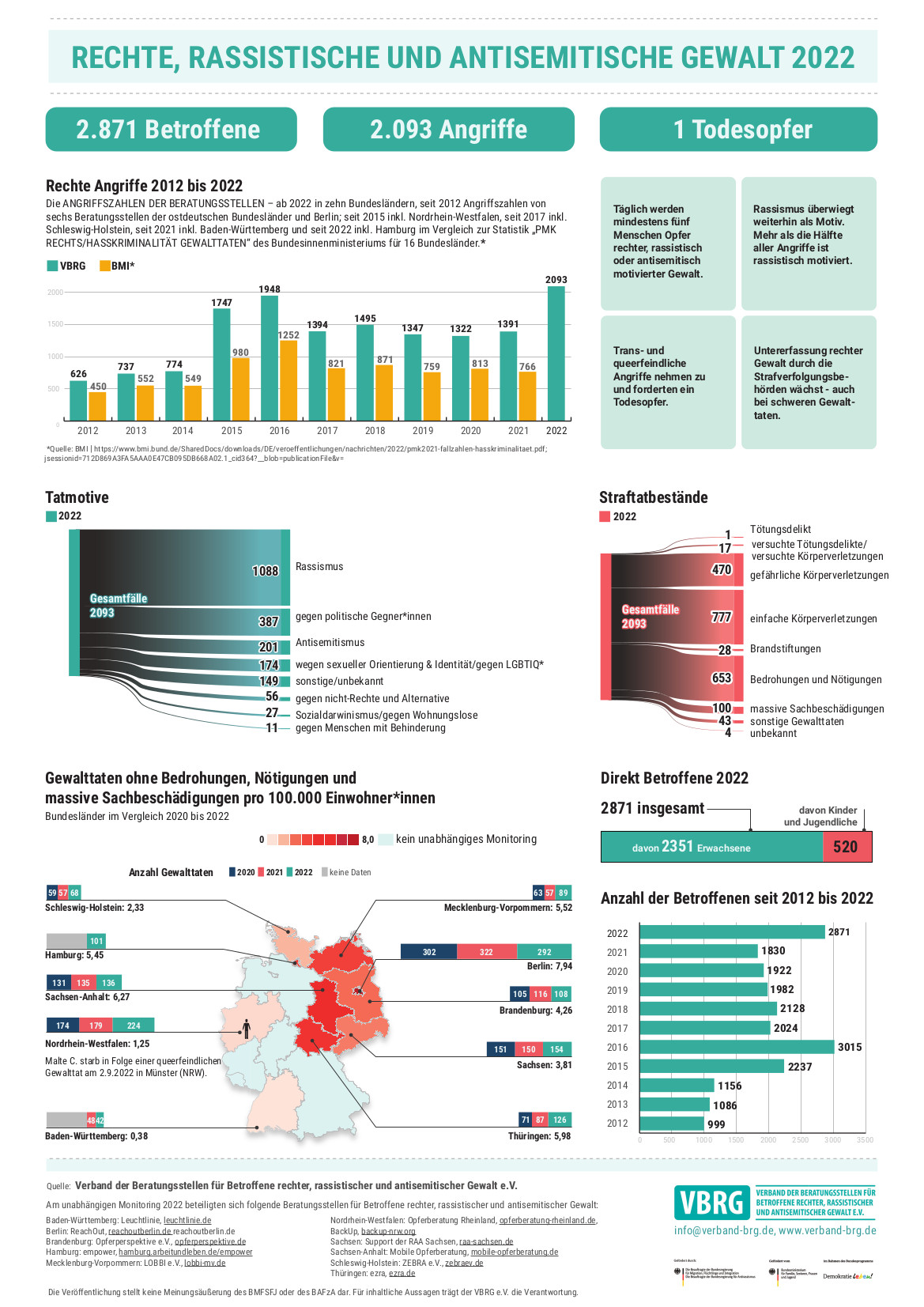 Die im VBRG e.V. zusammengeschlossenen Beratungsstellen haben für das Jahr 2022 einen Anstieg rechten, rassistischen und antisemitischen Gewalttaten in den ostdeutschen Bundesländern, Baden-Württemberg, Berlin, Hamburg Nordrhein-Westfalen und Schleswig-Holstein dokumentiert. Trotz Ausgangsbeschränkungen aufgrund der Pandemie bis zum Frühjahr 2022 wurden 2.093 rechts, rassistisch und antisemitisch motivierte Angriffe mit 2.871 Betroffenen registriert. Dabei hat sich die Anzahl der betroffenen Kinder und Jugendlichen im Vergleich zum Vorjahr auf 520 Angegriffene nahezu verdoppelt (2021: 288). Besorgniserregend ist sowohl der Anstieg von mehr als 15 Prozent bei rechten Gewalttaten (2022: 1340; 2021: 1151) – insbesondere Körperverletzungsdelikten – als auch eine Verdreifachung der Nötigungen und Bedrohungen insbesondere aus rassistischen und antisemitischen Motiven (2022: 653; 2021: 197).
