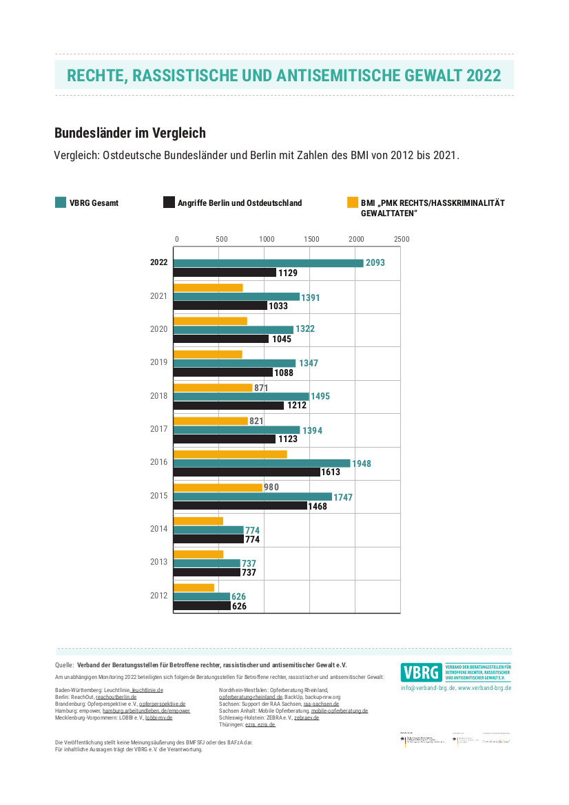Rassistische Mobilisierungen und Gewalt schaffen insbesondere in Ostdeutschland ein flächendeckendes Klima von Angst und Unsicherheit ++ Anstieg von mehr als 15 Prozent bei rechten Gewalttaten – insbesondere Körperverletzungsdelikten ++ Täglich ereigneten sich im Jahr 2022 bis zu fünf rechte Angriffe alleine in 10 von 16 Bundesländern ++ Rassismus ist bei mehr als der Hälfte der Fälle das dominante Tatmotiv ++ 2.871 Menschen waren 2022 von 2.093 politisch rechts motivierten Angriffen allein in Ostdeutschland, Baden-Württemberg, Berlin, Hamburg und Nordrhein-Westfalen und Schleswig-Holstein direkt betroffen. ++ Antisemitisch motivierte Angriffe haben sich im Vergleich zum Vorjahr vervierfacht. ++ Opferberatungsstellen registrieren auch eine Verdoppelung von Gewalttaten gegen Menschen LGBTIQA*+ Community, insbesondere gegen queere People of Colour und Transpersonen wie Malte C., der in Folge eines queer- und transfeindlich motivierten Angriffs starb. ++