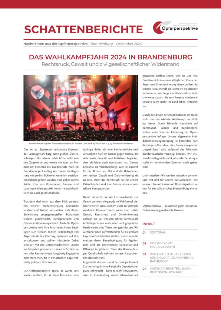 Die neue Ausgabe unserer Schattenberichte ist da! Darin blicken wir zurück auf das Wahlkampfjahr 2024 und auf zivilgesellschaftliches Engagement gegen Rechts in Brandenburg. Unter anderem in Form eines Interviews mit Maica Vierkant vom Aktionsbündnis Brandenburg.
