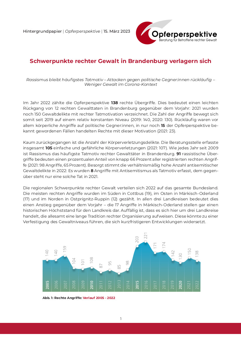 Ausführliche Analysen sowie die grafische Aufbereitung der Statistik finden sich im Hintergrundpapier zur Jahresstatistik 2022. Die Grafiken sind unter Nennung der Quelle (Peer Neumann/Opferperspektive) frei verwendbar. Zum Anschauen oder Herunterladen hier klicken: