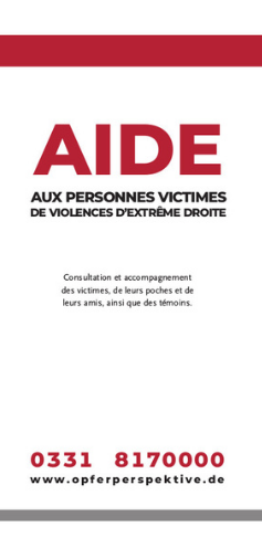 Le dépliant d’information du centre de conseil aux victimes de la violence d’extrême droite (Opferperspektive) s’adresse aux personnes qui ont…
