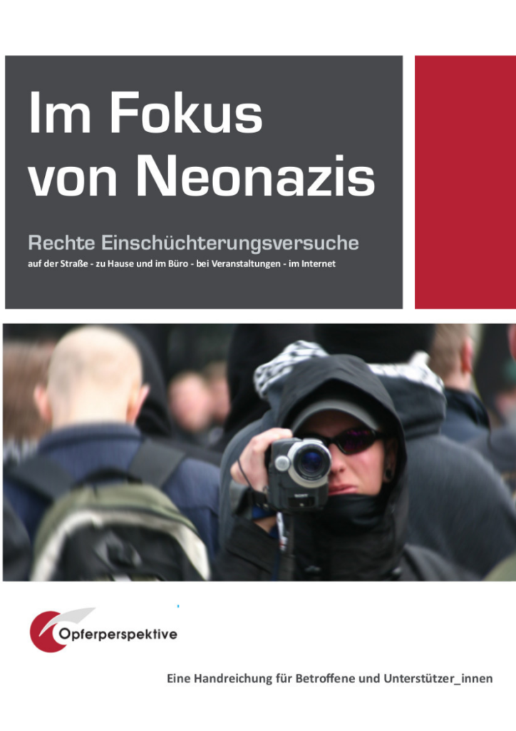 Die Optionen der direkt Betroffenen halten sich in vielen Fällen aber in Grenzen. Umso wichtiger sind daher die Reaktionen aus ihrem Umfeld. Deshalb wollen wir mit dieser Broschüre auch Menschen animieren, unterstützend aktiv zu werden. Nur wenn die Adressat_innen rechter Einschüchterungsversuche merken, dass sie nicht alleine sind und tätige Unterstützung erfahren, werden die rechten Täter auf Dauer keinen Erfolg haben.