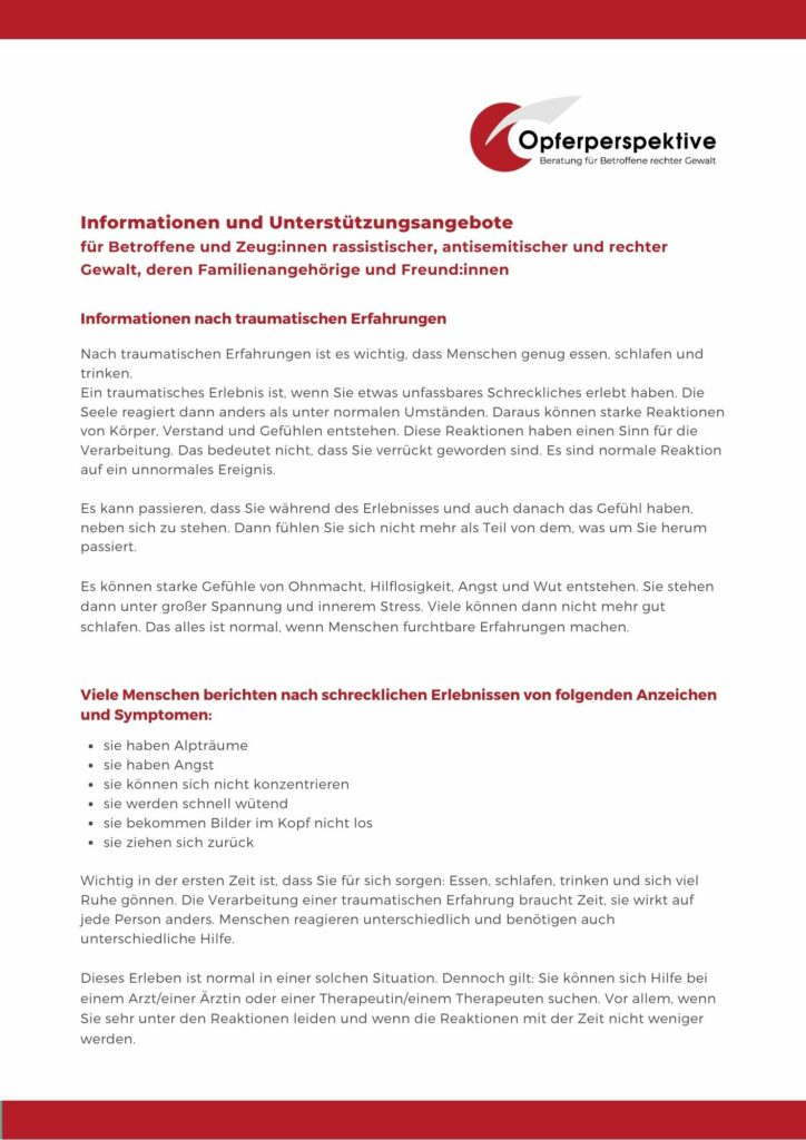 Sie können sich auch an die Opferperspektive e.V. wenden. Dort können Sie über das Erlebte sprechen, psychosoziale Beratung und Kontakte zu Ärzten und Ärztinnen und Therapeutinnen und Therapeuten bekommen.