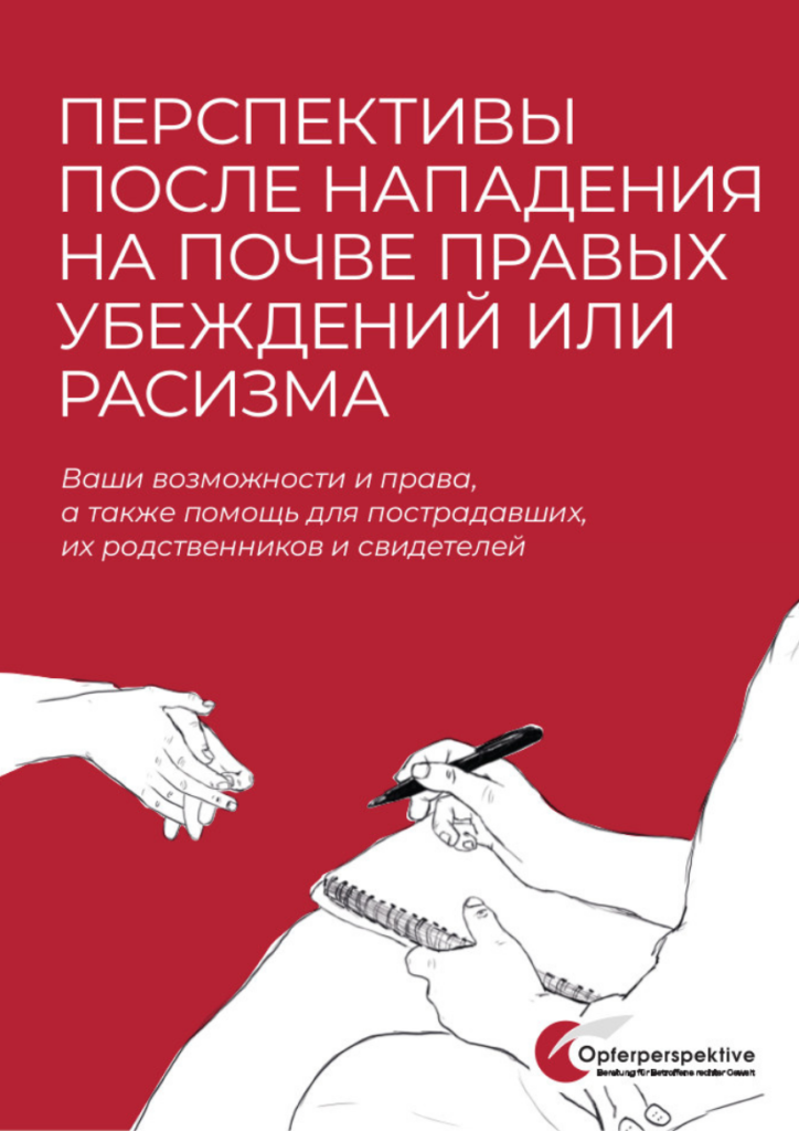 Организация «Перспектива пострадавших» – это независимое консультационное бюро для пострадавших от насилия на почве правых убеждений и расизма в федеральной земле Бранденбург. В приложении Вы найдёте адреса таких консультаций в других федеральных землях и другие полезные контакты.